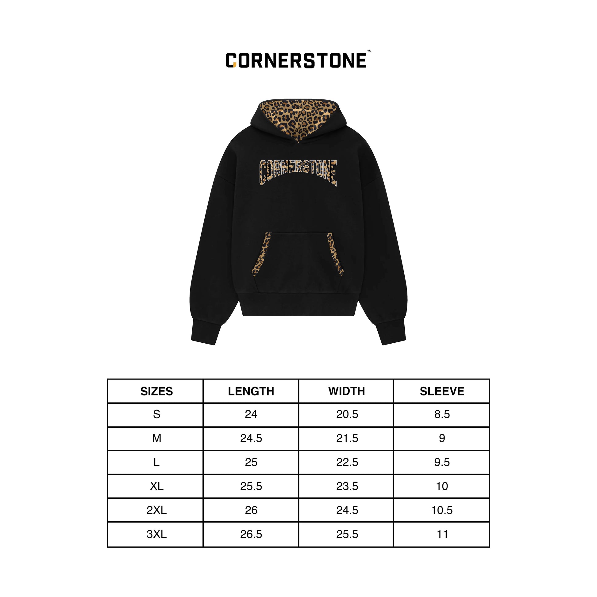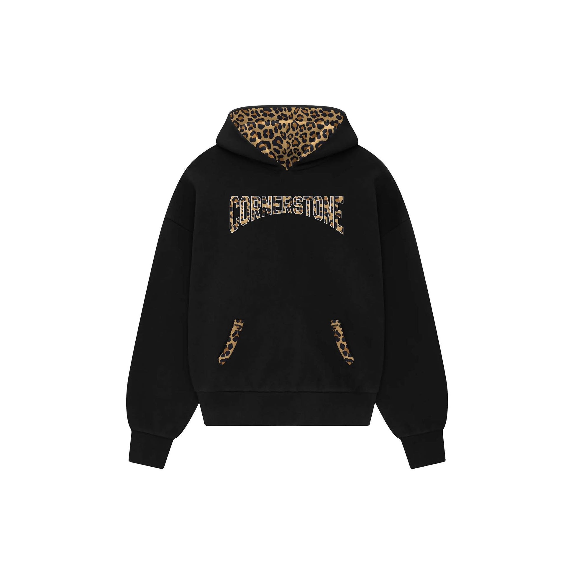 A boxy crop hoodie using a brush fleece cotton fabric. Drop shoulder fitting. It features our Cornerstone logo in an applique embroidered application, with an intricate details of leopard fabric on the kangaroo pocket. Elastic ribbed cuff and waistband for better feels and fit.
